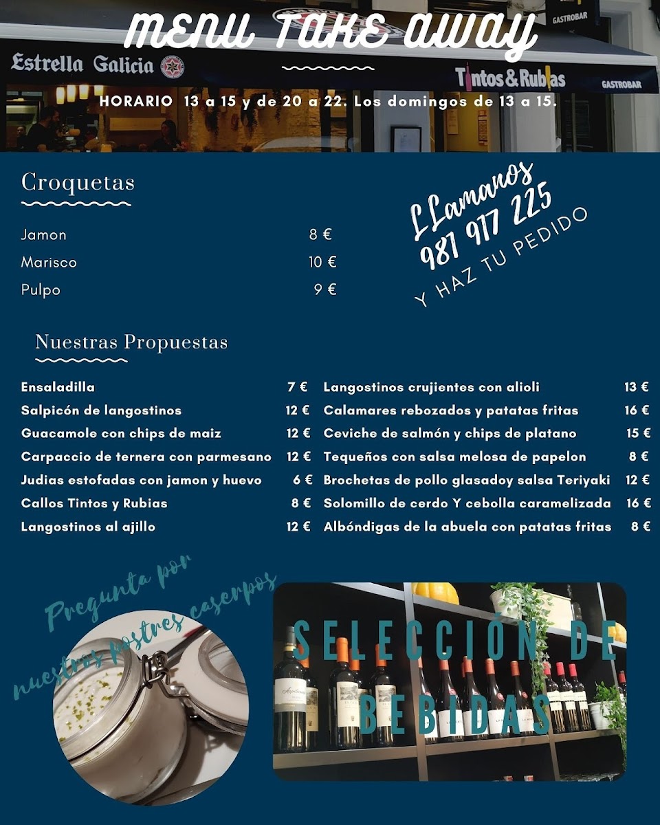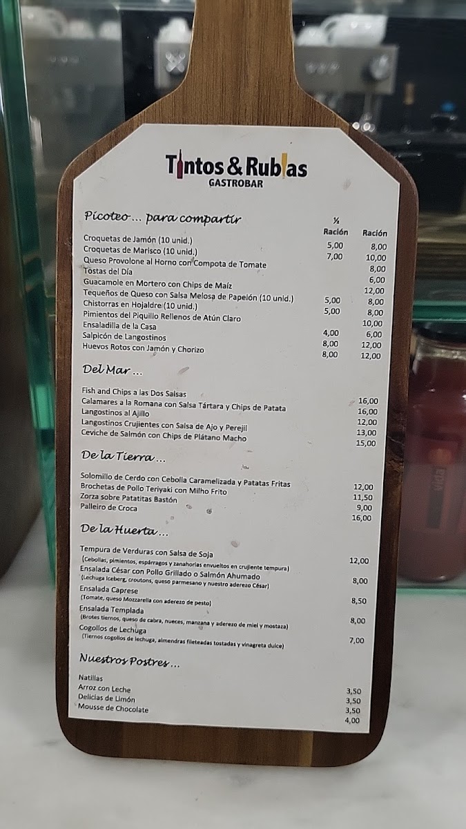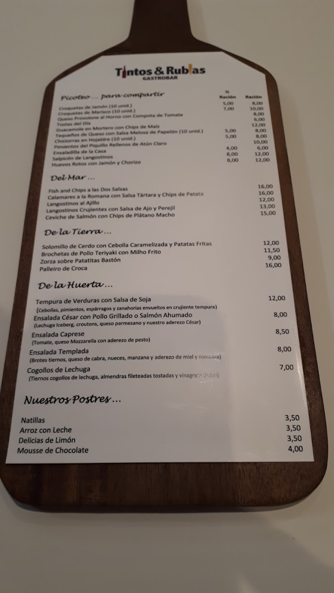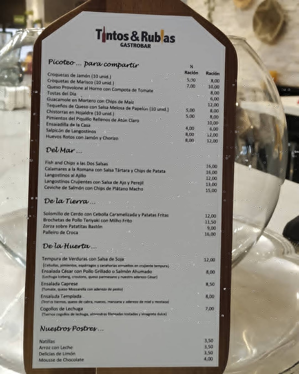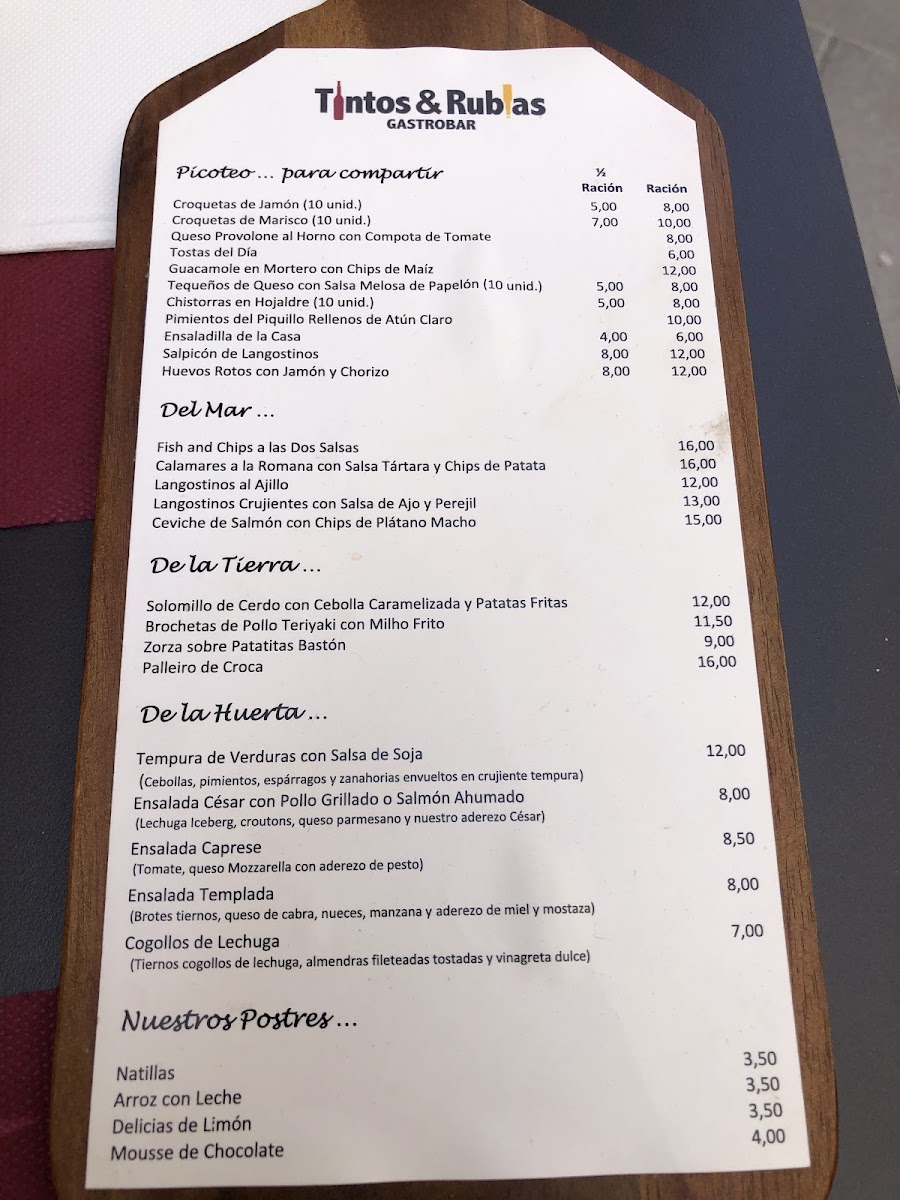 Tintos Y Rubias Gastrobar offers a menu that strikes a balance between inventive tapas and comforting classics, each dish showcasing careful attention to flavor and presentation. The Tequeños are a delightful start, crisp on the outside with a perfectly gooey cheese center, setting the tone for the creative yet approachable offerings. Seafood lovers will be drawn to the Flautas de Langostinos, which combine delicate prawns with a light, crunchy wrap, and the Fish and Chips, elevated with a tender, flaky fish and golden fries. The Croquetas Variadas and Croquetas de Centolla highlight the kitchen’s mastery of texture and seasoning, rich and satisfying without being heavy. For lighter bites, the Ensalada Templada delivers freshness and subtle warmth, while the simple yet essential Pan complements every dish effortlessly. Desserts maintain the same standard, with the Crema de Limón offering a tangy-sweet finale that is smooth, refreshing, and perfectly balanced. Each item feels thoughtfully composed, demonstrating that Tintos Y Rubias Gastrobar values both innovation and authenticity, making the menu a cohesive journey from start to finish.